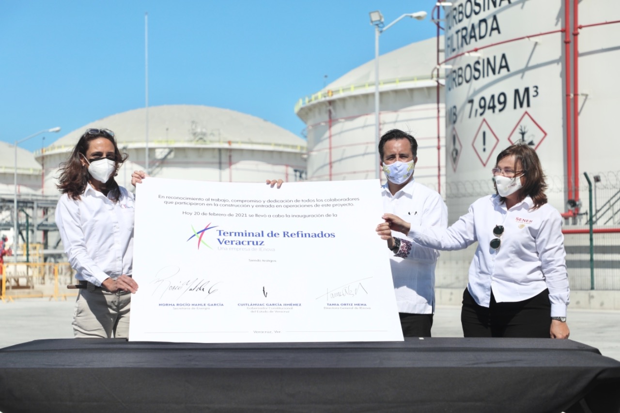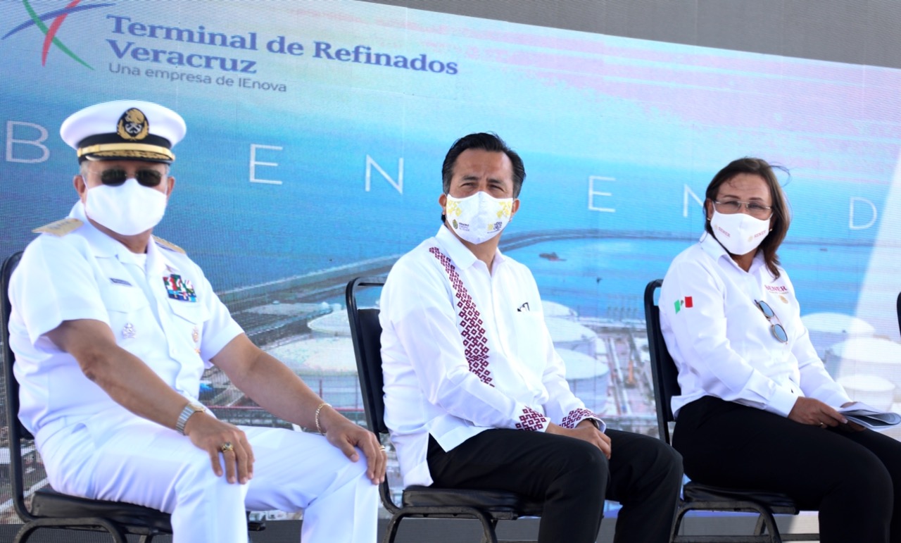 *Veracruz, Ver., 20 de febrero de 2021.-* Durante la inauguración de la Terminal de Refinados Veracruz, propiedad de Infraestructura Energética Nova (IEnova), el gobernador Cuitláhuac García Jiménez manifestó el apoyo incondicional a las inversiones que traigan empleo y desarrollo a la entidad, como es la directriz del Gobierno de México en materia energética.