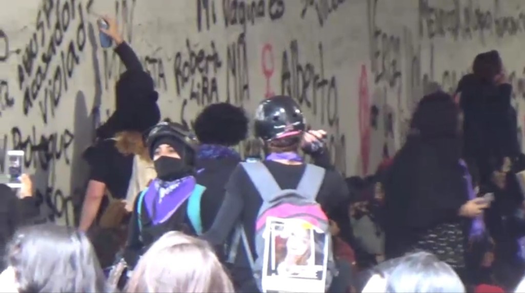Gritando consignas por las víctimas de feminicidios y el acoso y abuso policial las feministas se manifestaron con pancartas también en reconocimiento por las víctimas de desaparición forzada; a su paso por el edificio de la Secretaría de Seguridad Pública rompieron las ventanas y lanzaron gas al interior.