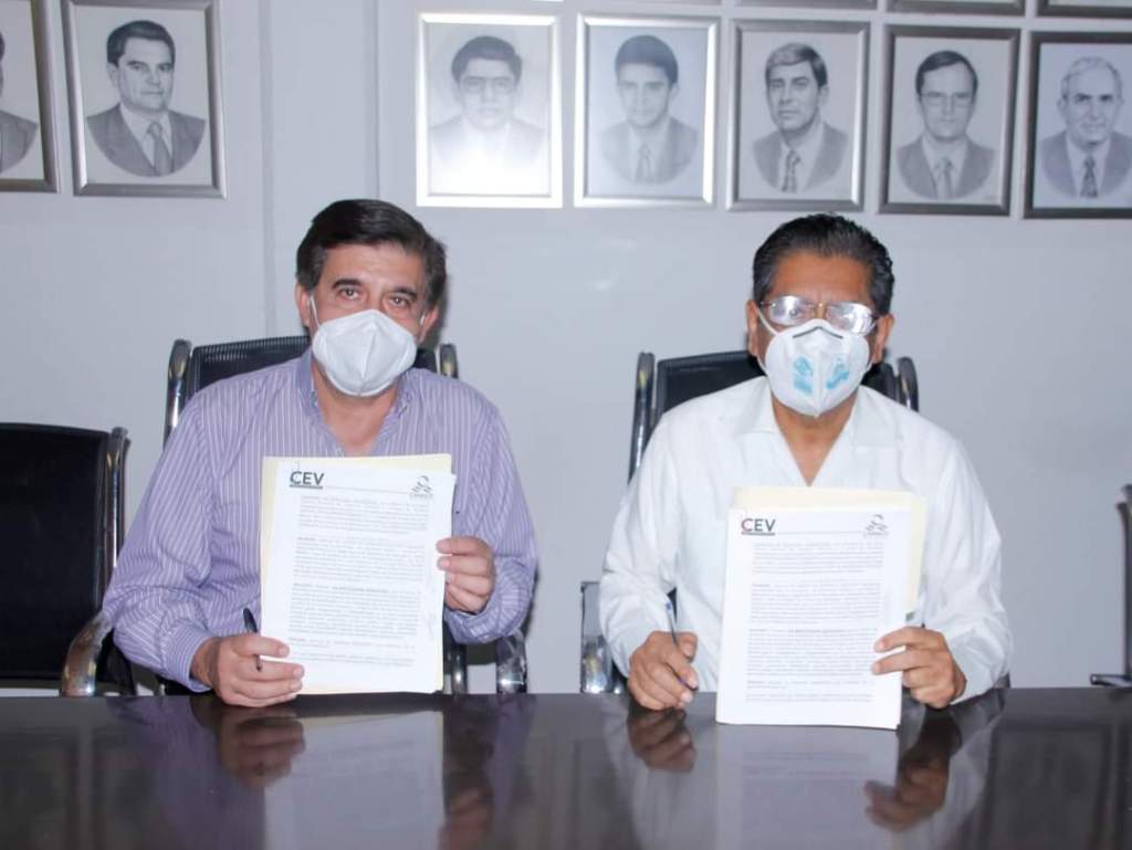 El Presidente de CANACO Servytur de Veracruz, José Antonio Mendoza García firmó el convenio de vinculación con el Centro de Enseñanza Veracruz S.C. representado en este acto por el rector Mtro. Carlos Raúl Velázquez Hernández y su Represéntate Legal “CEV” Centro de Estudios Veracruz.