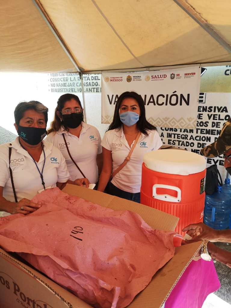 Al cumplirse el cuarto día de vacunación en Boca del Río, trabajadores del ayuntamiento realizan brigadas de asistencia e hidratación en los centros donde se aplica la inyección.