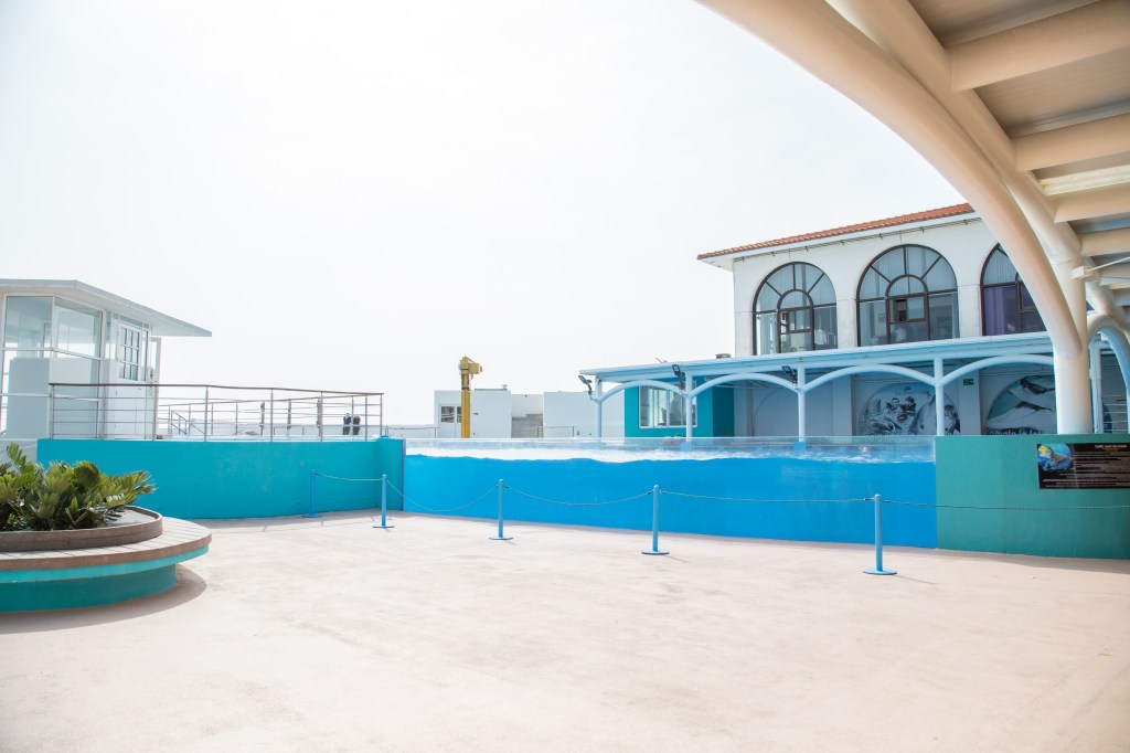 El delfinario cuenta con un tanque principal. El volumen total es de 2,500,000 litros de agua salada, con filtración automatizada y monitoreo de calidad de agua durante las 24 horas del día. Esta exhibición alberga 4 delfines nariz de botella que pueden ser observados por la parte alta del estanque al aire libre y también a través de 6 ventanales de acrílico. Y una vista subacuática donde se puede observar a los ejemplares desde la parte inferior de su estanque.