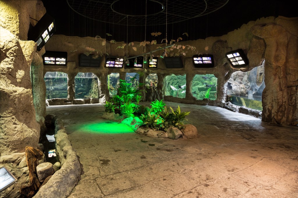 La sección cuenta con nueve peceras de diferentes volúmenes donde albergan más de 30 especies de peces del Amazonas, Asia, África y América así como reptiles y mamíferos representativos de estas diferentes zonas. El volumen total de esta galería es de 562 177 litros, la cual está ambientada como una caverna donde se pueden admirar especies de peces muy diversas.