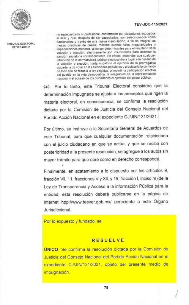 De esta forma el TEV confirma la resolución dictada por la Comisión de Justicia del Consejo Nacional del Partido Acción Nacional en el expediente CJ/JIN/131/2021, y en consecuencia, los resultados del cómputo y validez de la elección interna para la selección de las candidaturas a integrantes del Ayuntamiento de Veracruz.