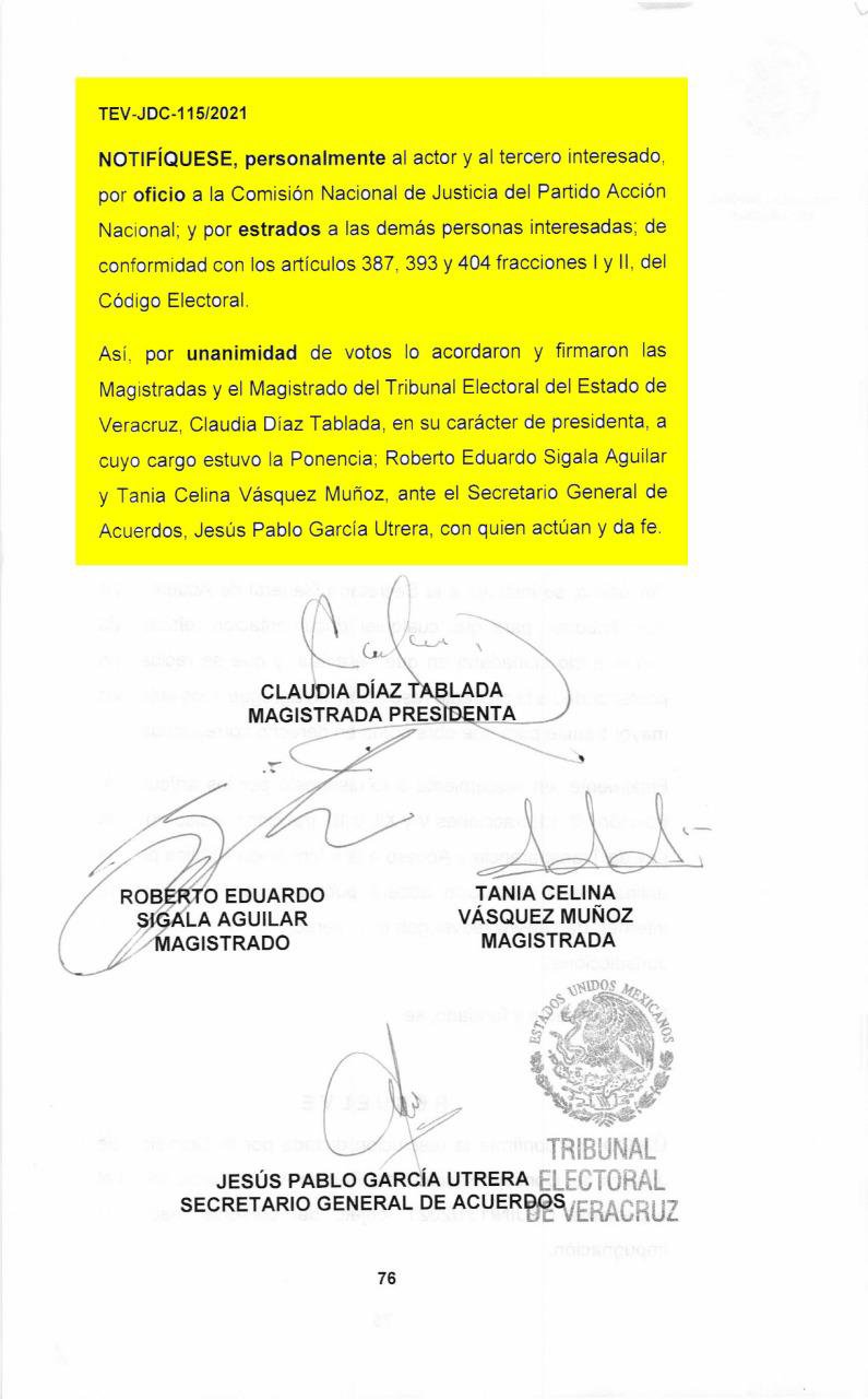 El acta de sentencia del Tribunal Electoral fue firmada por Claudia Díaz Tablada, en su carácter de magistrada presidenta, a cuyo cargo estuvo la ponencia; y los magistrados Roberto Eduardo Sigala Aguilar y Tania Celina Vásquez Muñoz, ante el secretario general de acuerdos Jesús Pablo García Utrera.