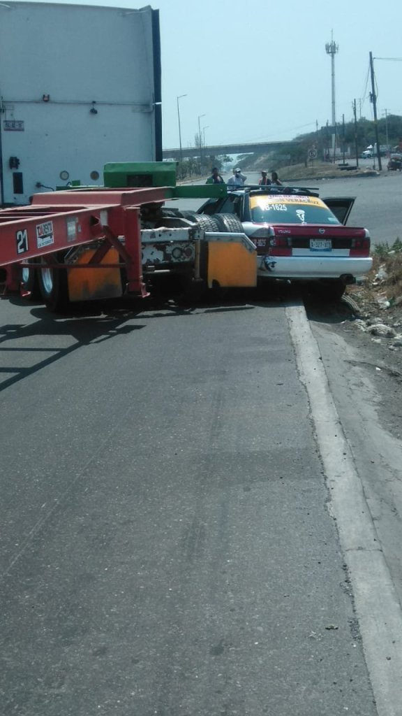 Tráfico intenso se registra esta tarde en la carretera Veracruz-cardel, a la altura del kilómetro 13 y medio, debido al choque entre 2 trailers y un taxi con número económico 1625.