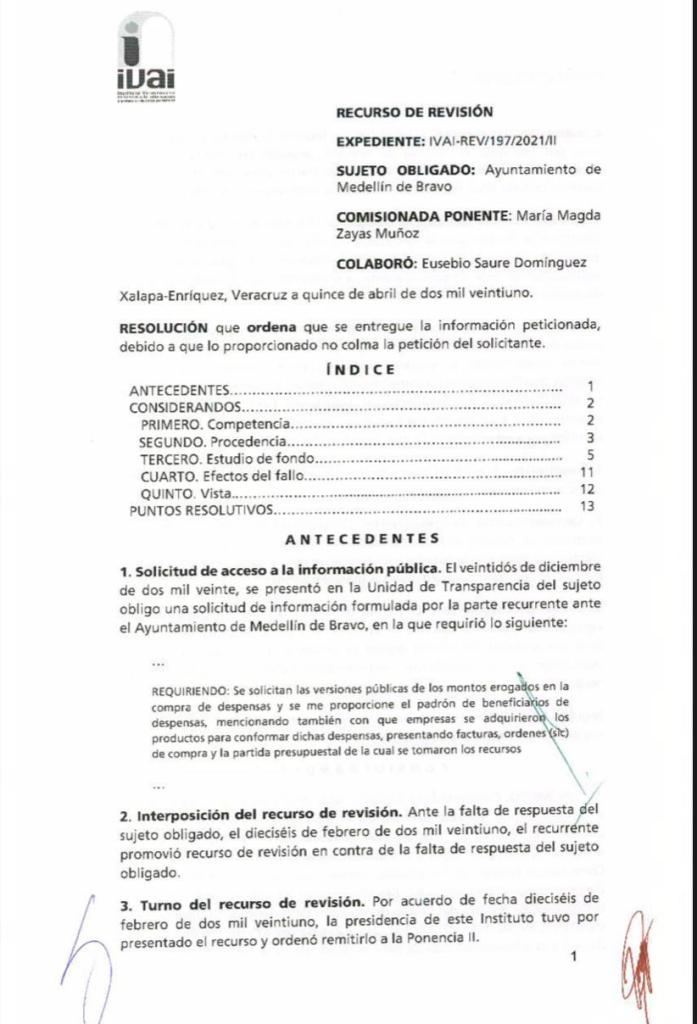En el expediente IVAI-REV/197/2021/II, con fecha del 15 de abril pasado, se indica que a partir de la fecha de notificación, realizada ayer 19 de abril, y en un plazo no mayor a tres días hábiles, el Ayuntamiento de Medellín dé a conocer el monto erogado en la compra de despensas, el número de beneficiarios, el nombre de empresas a las que les fueron adquiridos los productos para las despensas, presentación de facturas, órdenes de compra y la partida presupuestal de dónde se tomaron los recursos.