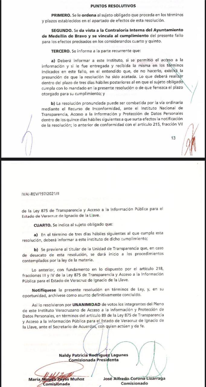 También le ordena al Ayuntamiento de Medellín que al haber un ciudadano involucrado y al cual no le fue entregada la información, avisé a su Unidad de Acceso a la Información de la Contraloría Interna en un plazo no mayor a tres días.