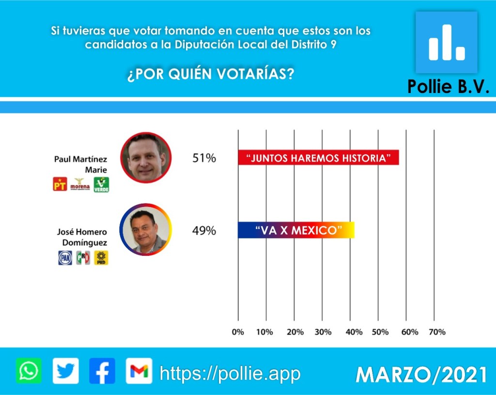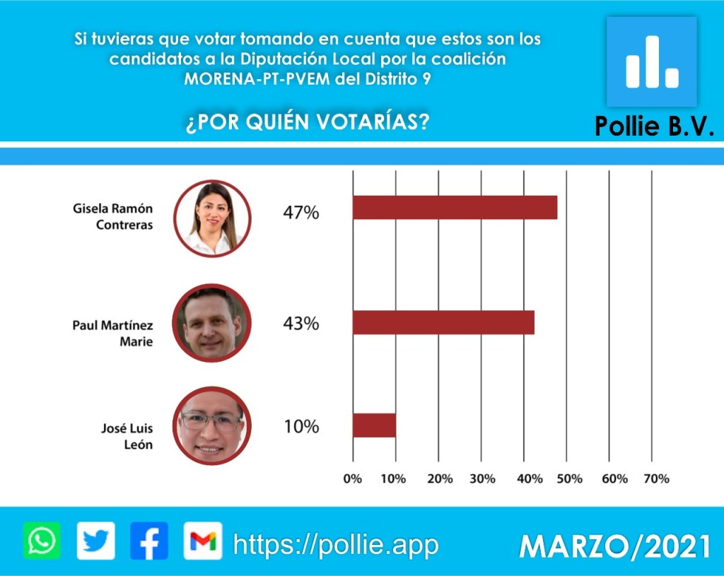 La pregunta del sondeo dice lo siguiente: ¿Por qué candidato de la alianza juntos haremos historia conformada por MORENA, Verde y PT votarían? Y los resultados fueron… Gisela Ramón 47% de aceptación, Paul Martínez 43% y José Luis León 10%.