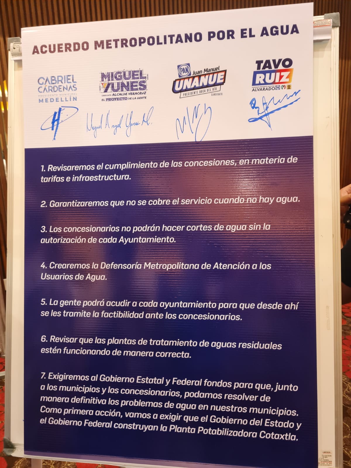 Los candidatos a Alcaldes por Veracruz, Miguel Ángel Yunes Márquez, (Veracruz Va); Juan Manuel Unánue de Boca del Río (PAN); Tavo Ruiz Barroso de Alvarado (Veracruz Va) y Gabriel Cárdenas Guízar de Medellín de Bravo (Veracruz Va), arrancaron su campaña en el puerto de Veracruz, firmando el «Acuerdo Metropolitano por el Agua».
