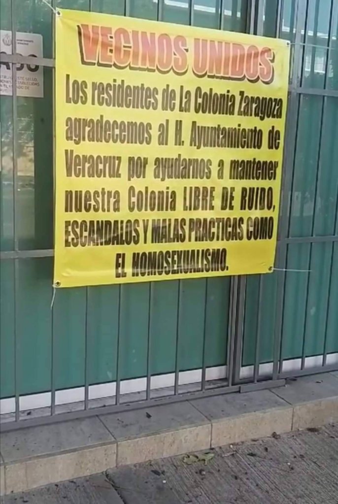 Cabe recordar que este miercoles por la mañana comenzó a circular una lona ubicada en la calle Santos Pérez Abascal en la colonia Zaragoza, que decía «Vecinos Unidos, los residentes de la Colonia Zaragoza agradecemos al H. Ayuntamiento de Veracruz por ayudarnos a mantener nuestra colonia LIBRE DE RUIDO, ESCANDALOS Y MALAS PRACTICAS COMO EL HOMOSEXUALISMO».