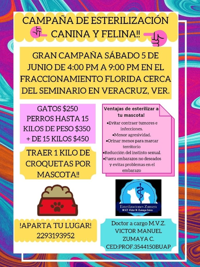 Este sábado 5 de junio del año en curso se efectuará una campaña de esterilización canina y felina organizada por un grupo de animalistas independientes, de 4:00 de la tarde a 9:00 de la noche en la calle Circuito Florida Poniente N° 371 entre Magnolias y Margaritas del fraccionamiento La Florida del municipio porteño.
