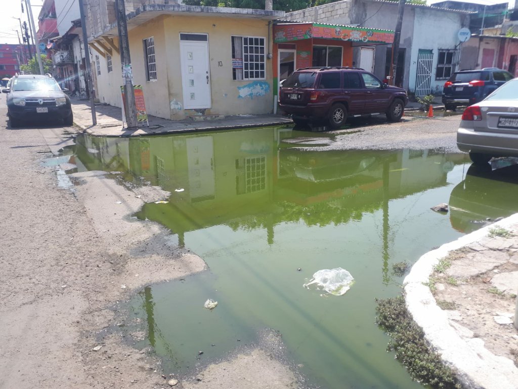 Los vecinos mencionan que el desnivel de la calle impide que el agua circule, por lo que se llega a quedar estancada por varias semanas.