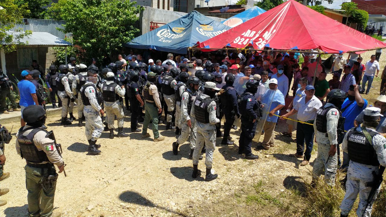 Ante este panorama fue necesaria la presencia de la Guardia Nacional y de granaderos de la SSP para garantizar la paz y la seguridad de los enviados del OPLE; sin embargo, a los petistas pocos les importó la presencia de la autoridad y agredieron e insultaron a los elementos de la Guardia Nacional.