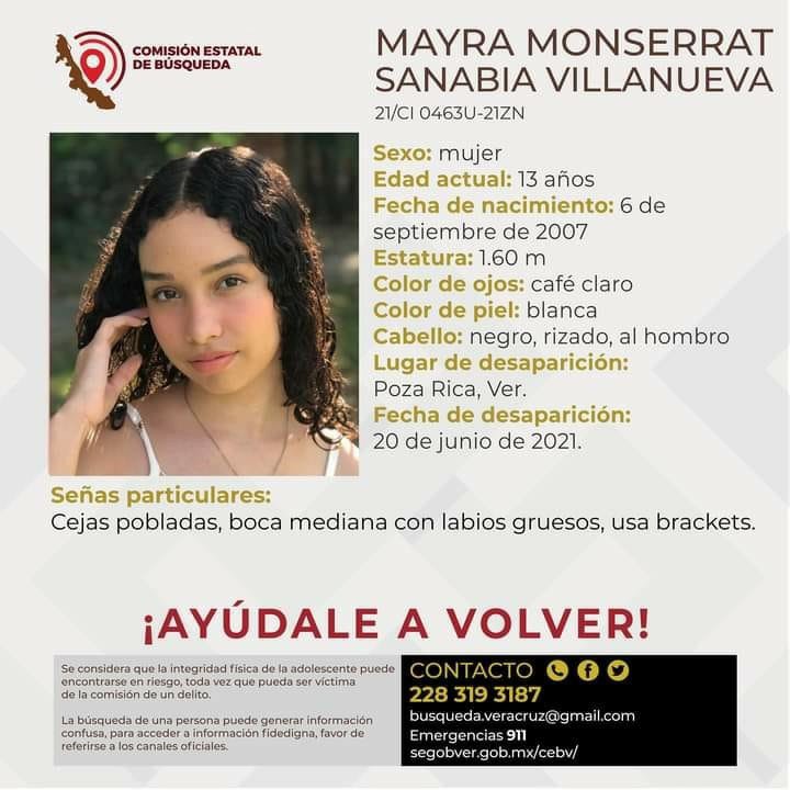 Poza Rica, Ver.- La Comisión Estatal de Búsqueda, emitió una alerta la noche de este martes para dar con el paradero de Monserrat Sanabia Villanueva de 13 años de edad y de quien no se conoce su paradero desde el pasado 20 de junio.