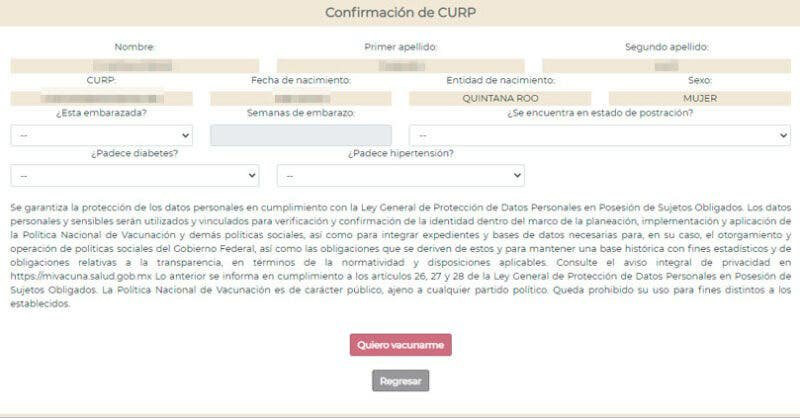 Una vez que ingreses tu CURP es importante que verifiques que tus datos estén correctos. También, deberás llenar los campos para indicar si estás embarazada, cuántas semanas de gestación tienes hasta el momento, si te encuentras en estado de postración o si padeces enfermedades como diabetes e hipertensión.