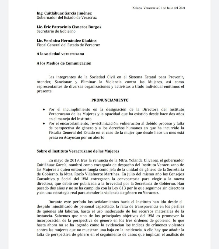 De la misma manera, en el documento puntualizan que el Gobierno del Estado tiene dos años sin nombrar a una titular del Instituto Veracruzano de la Mujer, ocasionando una falta de apoyo a miles de mujeres en la entidad veracruzana; además de incumplir con las Alertas de Violencia de Género que pesan sobre Veracruz.