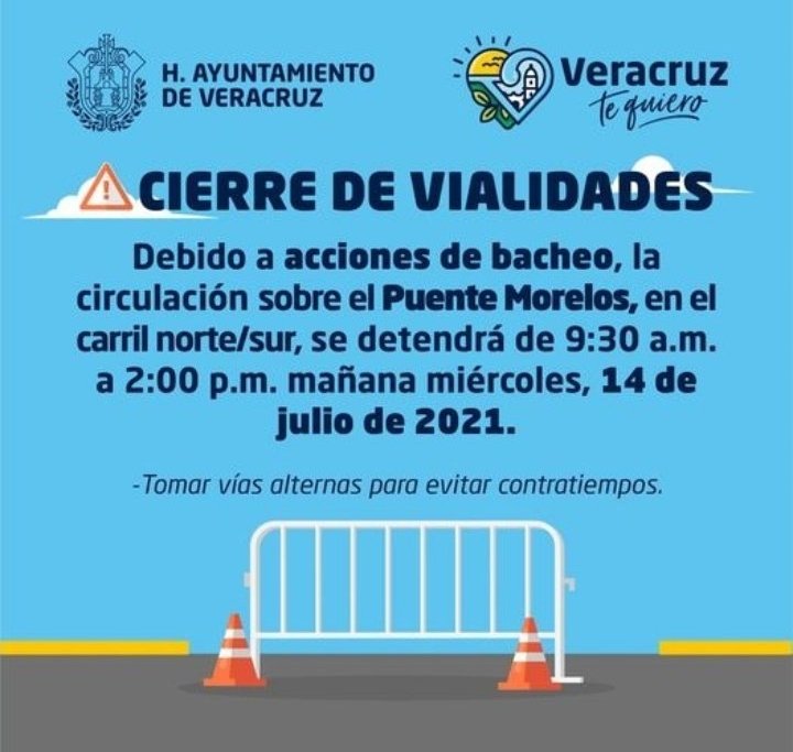 El H. Ayuntamiento de Veracruz informó en un aviso que este miércoles 14 de julio del año en curso, se mantendrá cerrada la circulación vehicular en el carril norte-sur del puente Morelos, que conecta la zona sur de Veracruz con el Centro Histórico.