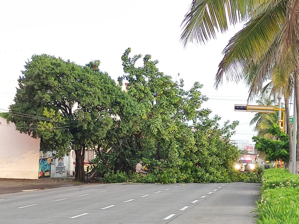 Un enorme árbol localizado en la esquina de la avenida Allende y la calle Arista en el centro de la ciudad cayó durante la noche de este jueves y madrugada del viernes debido a las fuertes lluvias, por lo que, la mañana de este viernes, personal del área de mantenimiento urbano del ayuntamiento porteño trabajaron gran parte del día para liberar la zona.