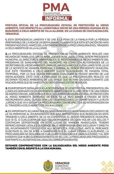Boca del Río, Ver. – La Procuraduría de Medio Ambiente se deslinda de la muerte de una persona en el tiradero a cielo abierto en la localidad de Villa Allende dentro del municipio de Coatzacoalcos; mismo que se encontraba clausurado desde el pasado lunes 12 de julio por esta misma instancia.