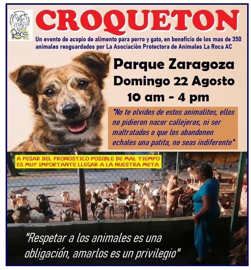 La asociación protectora de animales La Roca, A.C., lanzó una invitación a las familias a participar en la próxima edición del “Croquetón”, que se efectuará este domingo 22 de agosto en el Parque Zaragoza informó la presidenta de la agrupación, Norma Cortina Pérez.