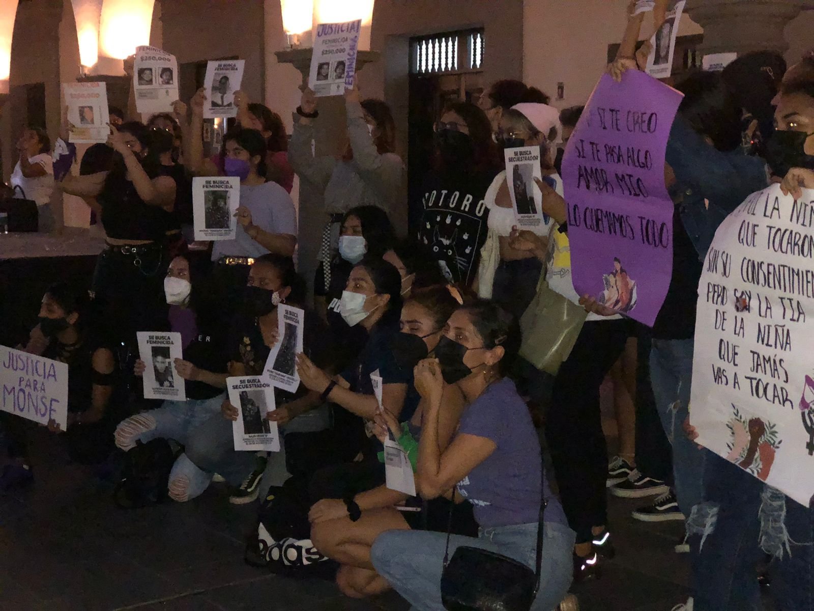 Como muestra de su repudio ante la poca respuesta de las autoridades de justicia, esta tarde miembros de la colectiva feminista Brujas del Mar se manifestaron en el zócalo de Veracruz para exhibir imágenes de los agresores de mujeres y feminicidas, tapizando parte del Palacio Municipal y mostrando sus rostros, así como para exigir que estos casos no queden en la impunidad.