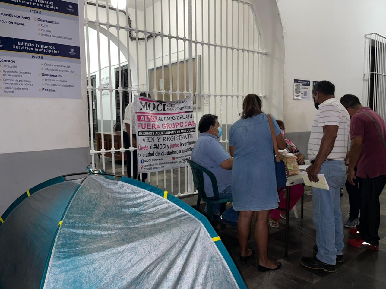 *Veracruz, Ver.-* Luego de siete días de permanecer en un campamento de manera pacífica, en los bajos del Palacio Municipal de Veracruz, exigiendo la salida del Grupo Metropolitano de Agua y Saneamiento (Grupo Mas); los integrantes de esta asociación tomaron de manera definitiva las puertas principales del Palacio y de las oficinas del Edificio Trigueros, como forma de presión para ser escuchados por las autoridades.