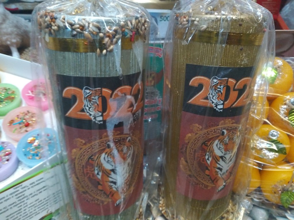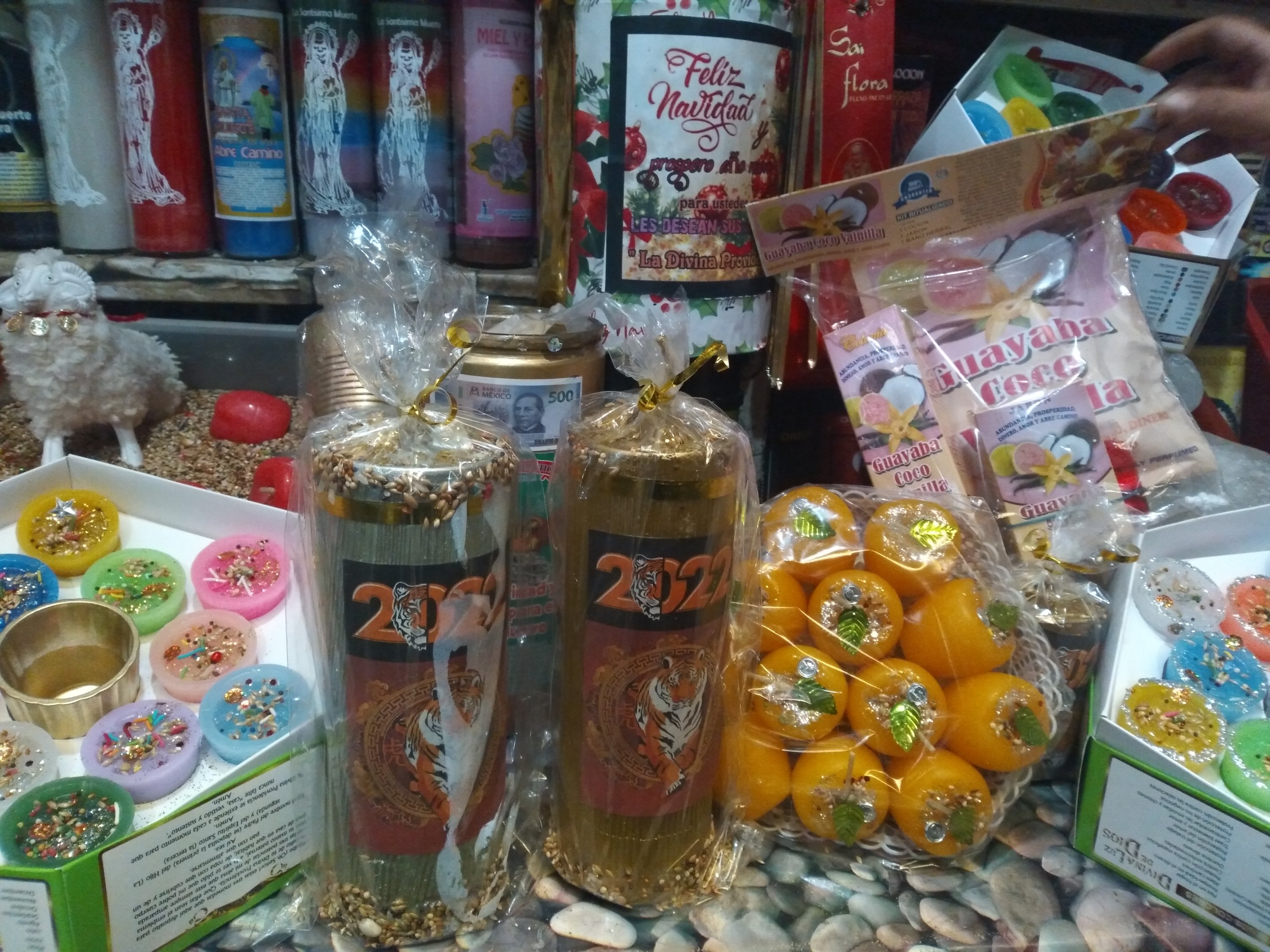 También se ofertan en el mercado canastas que contienen 12 veladoras de diferentes colores en forma de pirámides o velas normales , las cuales se encienden cada inicio de mes y tienen diferentes significados, pero en su mayoría son para atraer la fortuna,sin embargo a decir de Angelica Jannet las ventas no van del todo bien,pero espera que en estos ultimos dos dias del 2021 tenga un repunte.