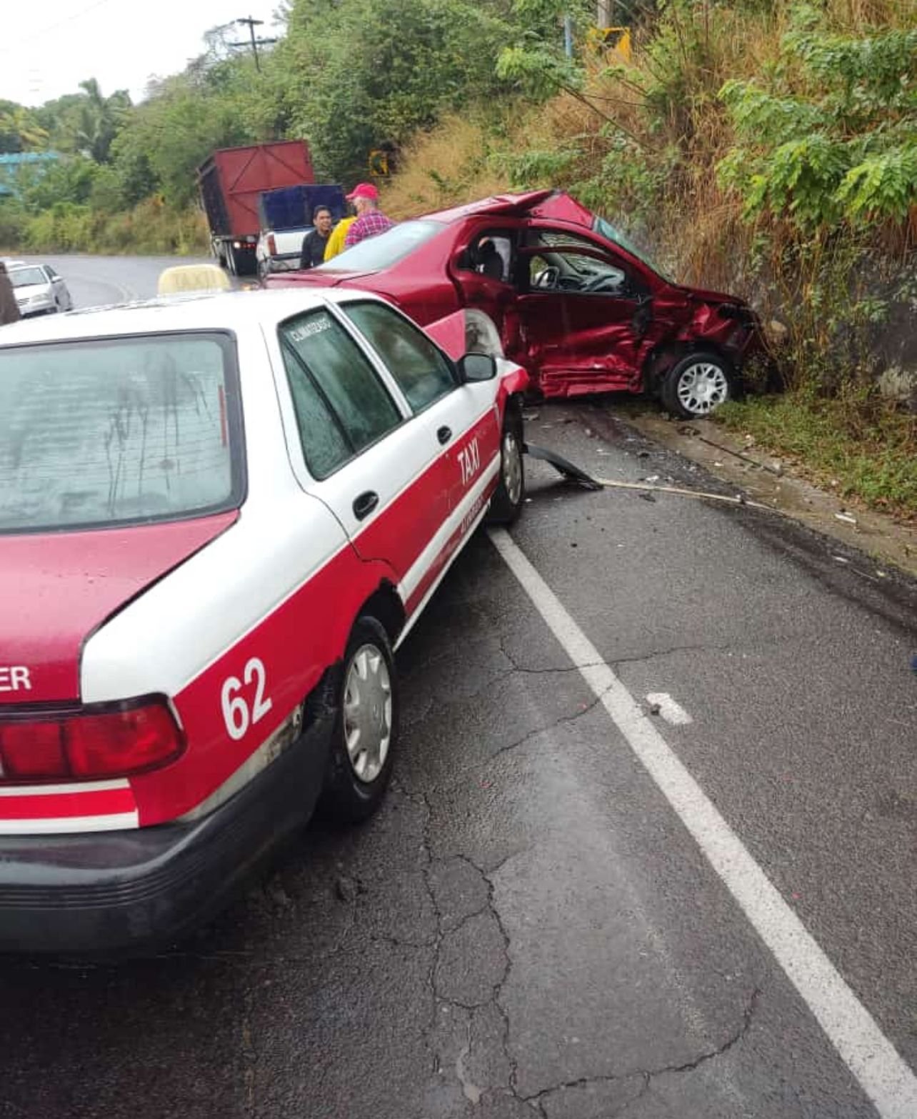 Los hechos ocurrieron la tarde de este lunes en la curva del parque deportivo «Miguel Alemán Valdez», donde presuntamente el conductor del carro rojo, según relatan testigos, se cruzó el carril al perder el control por la lluvia y fue impactado por la unidad de renta.