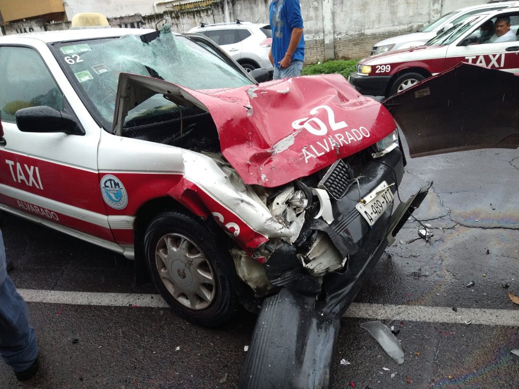 Alvarado, Ver.- Una persona que conducía un automóvil Ford rojo, marca Figo con placas YKF-287-A, perdió el control en la cabecera municipal de Alvarado debido a la lluvia y fue impactado por el taxi con número económico 62, dejando a un pasajero de la tercera edad severamente herido de su rostro.