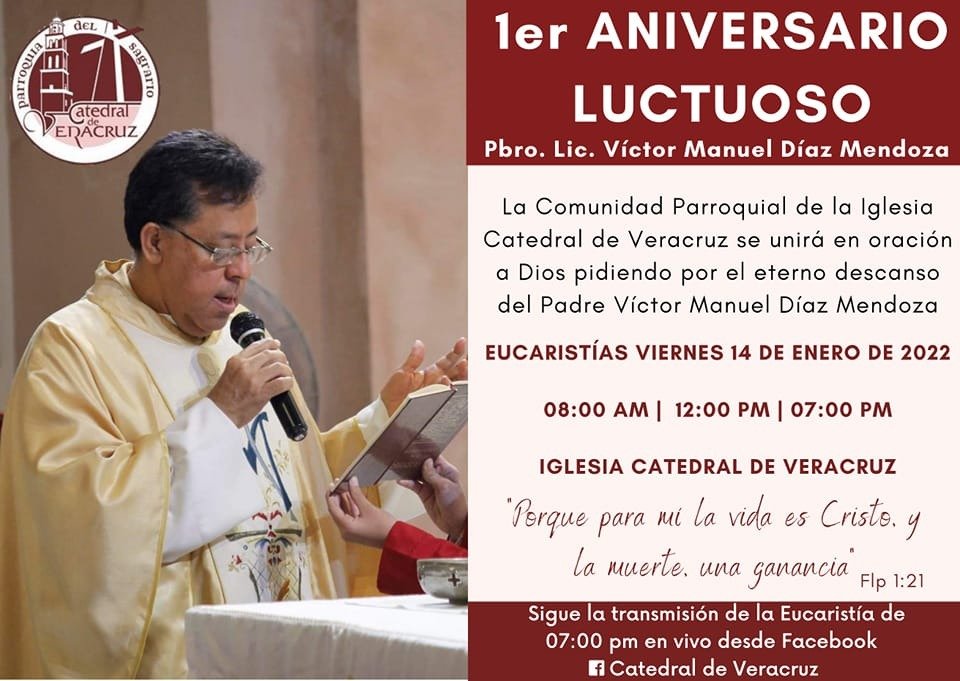 Este viernes 14 de enero del presente año, la Diócesis de Veracruz, realizará tres misas con motivo del primer aniversario luctuoso del padre Víctor Manuel Díaz Mendoza, quien fuera vocero y vicario de esta jurisdicción.