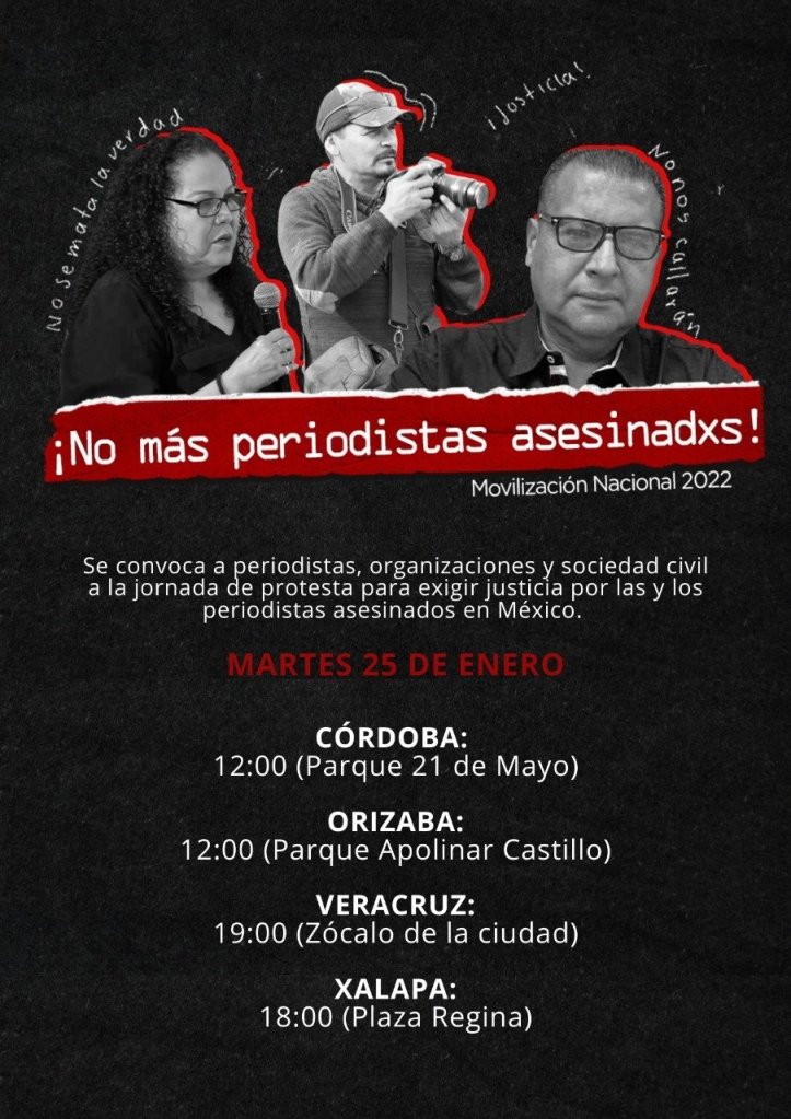 Dicha convocatoria se lazó por parte de las agrupaciones: Periodistas en México, la Red Veracruzana de Periodistas, la Asociación de Periodistas de Veracruz y grupos de periodistas organizados en el estado, las cuales invitaron a integrantes de la prensa a participar este este martes 24 de enero en las distintas movilizaciones.