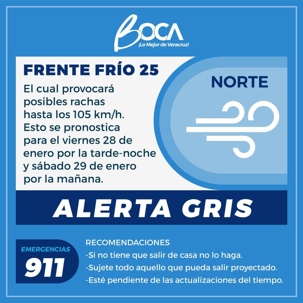Ante la Alerta Gris emitida por las autoridades estatales por el ingreso del Frente Frío número 25, Protección Civil de Boca del Río informó que se pronostica viento del norte con posibles rachas entre los 90 a 105 kilómetros por hora para el día viernes 28 y el sábado 29 de enero, y un marcado descenso en la temperatura.