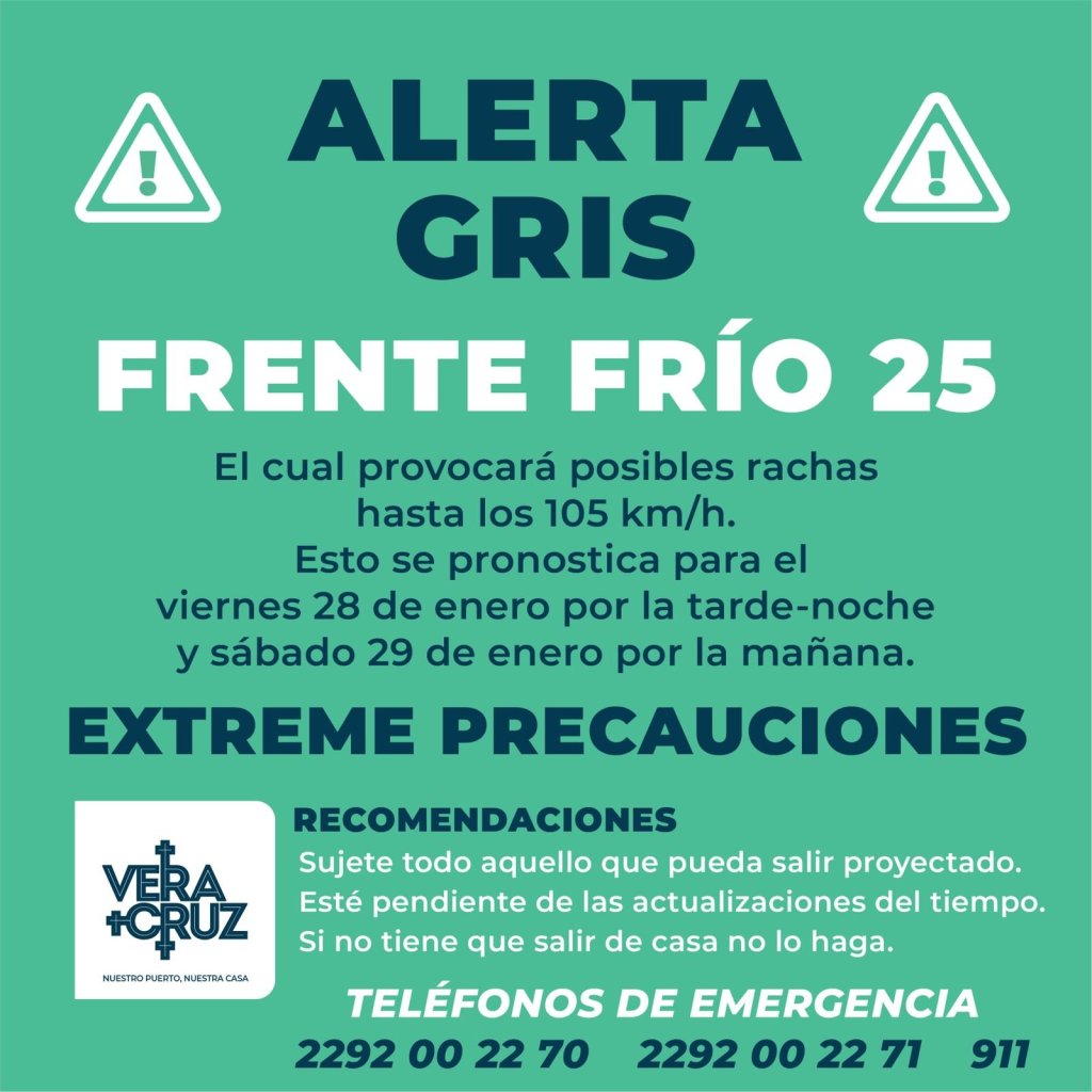 El Gobierno Municipal de Veracruz, a través de la Unidad de Protección Civil, informa sobre la Alerta Gris por la entrada del Frente Frío No. 25, emitida por las autoridades estatales, el cual dejará vientos del norte con posibles rachas máximas de 105 km/h para la tarde-noche del día viernes 28 y la mañana del sábado 29 de enero, con un marcado descenso de la temperatura.