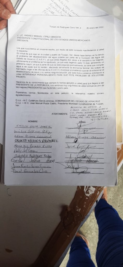 Tuxpan, Ver.- Casi 10 colonias del municipio de Tuxpan de Rodríguez Cano se quedaron sin el suministro de agua potable durante tres meses; ante esta situación, un grupo de ciudadanos recauda firma, en contra del mal funcionamiento de la CAEV, y esperan llevar el documento ante el presidente de la república, Andrés Manuel López Obrador.