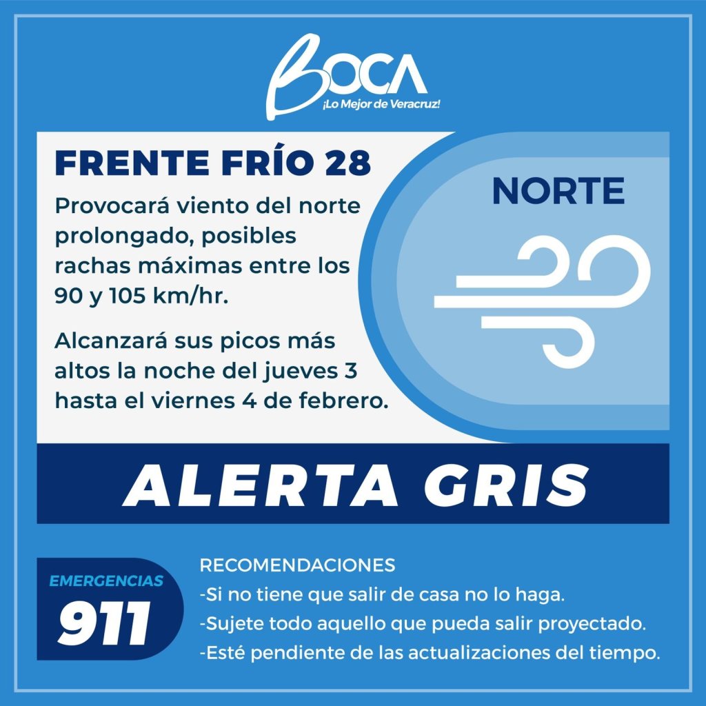 Ante la Alerta Gris emitida por las autoridades estatales por el ingreso del Frente Frío número 28, Protección Civil de Boca del Río informó que se pronostica viento del norte con posibles rachas entre los 90 a 105 kilómetros por hora para la noche de este jueves.