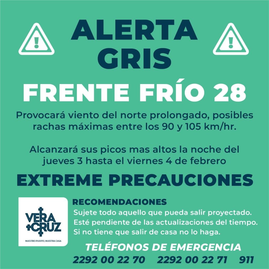 El Gobierno Municipal de Veracruz, a través de la Unidad de Protección Civil, informa sobre la Alerta Gris por la entrada del Frente Frío No. 28, emitida por las autoridades estatales, el cual provocará viento del norte prolongado, con posibles rachas máximas entre los 90 y 105 kilómetros por kilómetros.