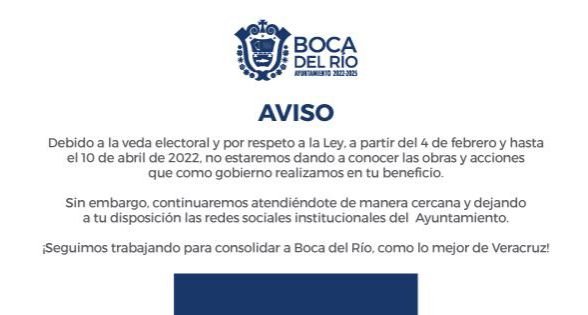 El alcalde de Boca del Río, Juan Manuel Unanue Abascal, informó que debido a la veda electoral y por respeto a la Ley, a partir de este 4 de febrero y hasta el 10 de abril de 2022, no estará difundiendo las obras y acciones que como gobierno realiza en beneficio de la ciudadanía.