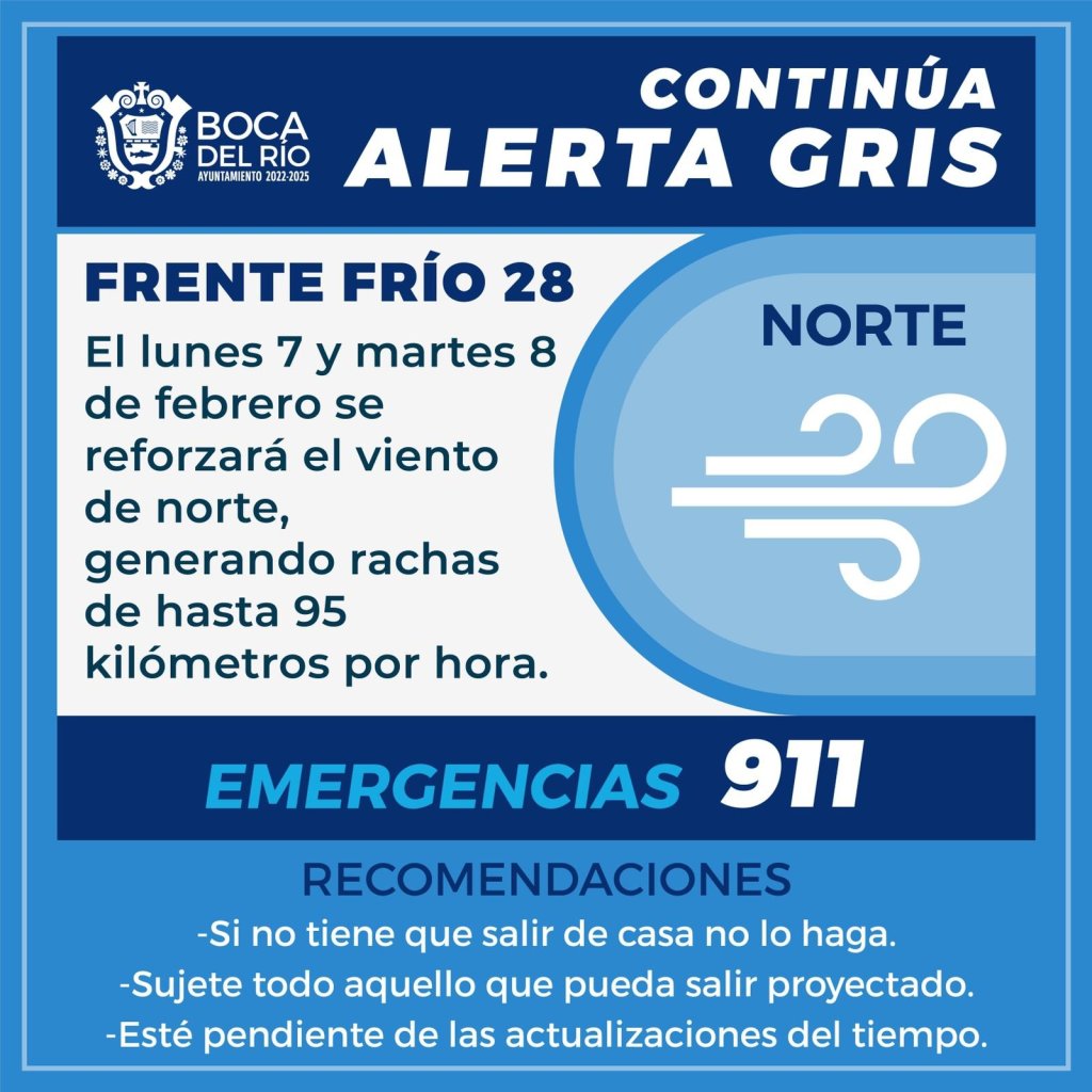 Al continuar la Alerta Gris emitida por las autoridades estatales por el Frente Frío 28, Protección Civil de Boca del Río informa que se pronostica viento del norte con posibles rachas de hasta los 95 kilómetros por hora para los días lunes 7 y martes 8 de febrero.
