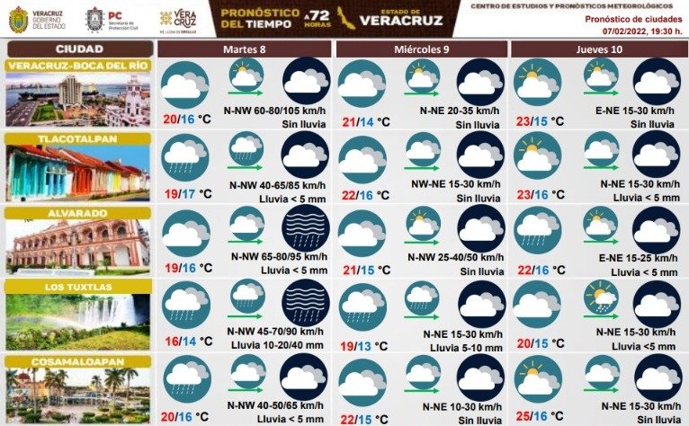 Asimismo, da a conocer que, a causa del aire frío y con un alto contenido de humedad que domina en territorio veracruzano, se ha registrado formación de cencellada (helada), aguanieve y pequeñas cantidades de nieve en la parte del Cofre de Perote.