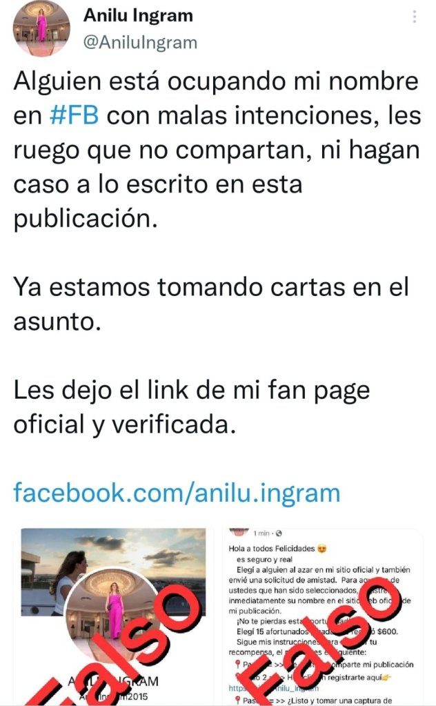 La veracruzana puntualizó qué en la red social Facebook, su cuenta oficial es Anilú. Ingram, la cual se encuentra autentificada con una paloma azul a la derecha del nombre.