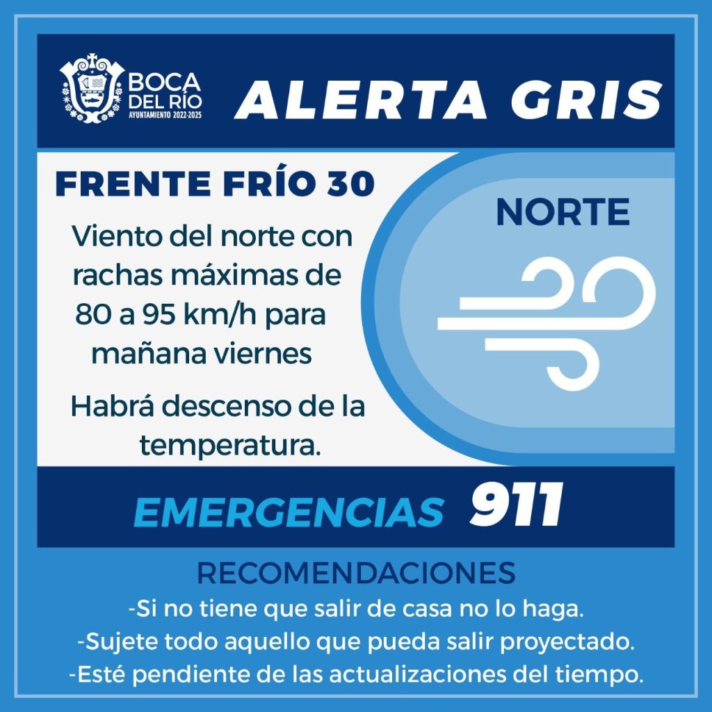 Ante la Alerta Gris emitida por las autoridades estatales por el ingreso del Frente Frío 30, Protección Civil de Boca del Río informó que se pronostica lluvia y viento del norte con posibles rachas máximas de 80 a 95 km/h para este viernes 18 de febrero.