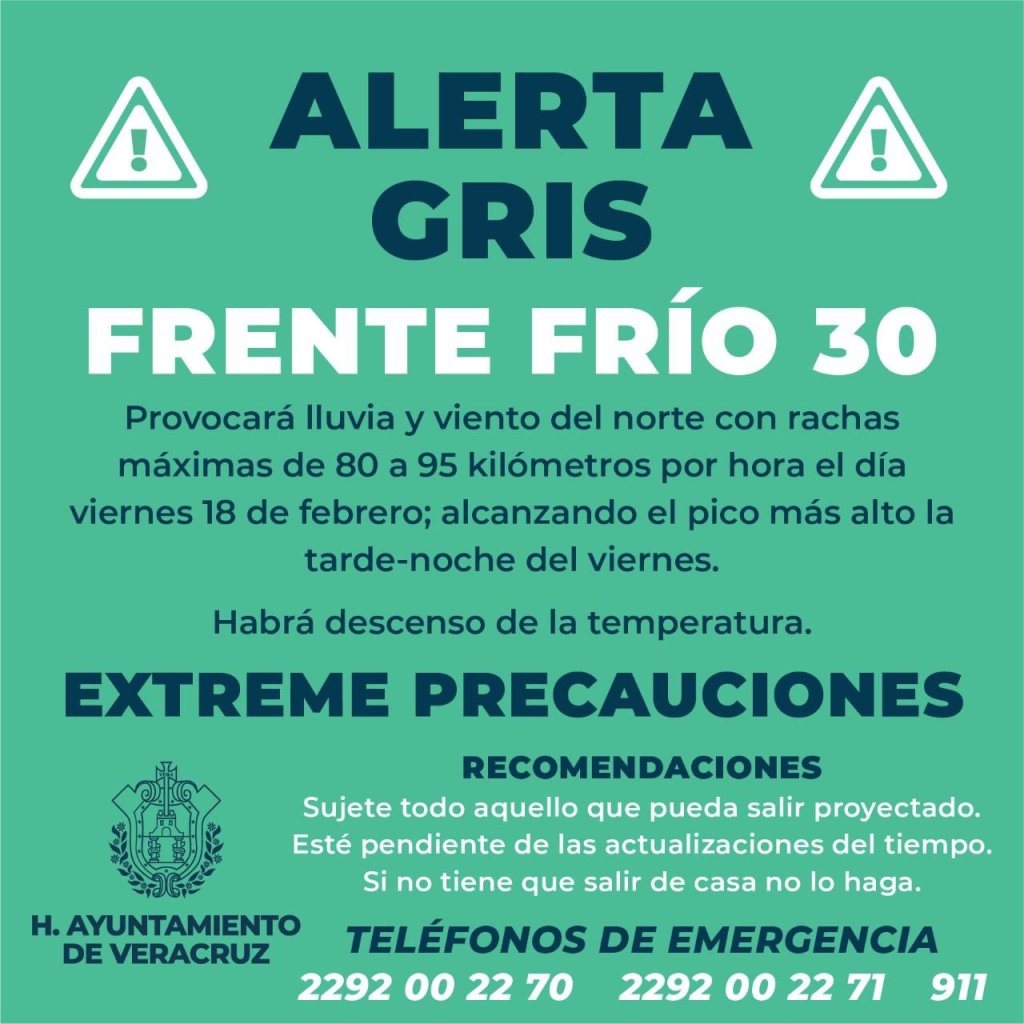 El Gobierno Municipal de Veracruz, a través de la Unidad de Protección Civil, informa sobre la Alerta Gris por la entrada del Frente Frío No. 30, emitida por las autoridades estatales, el cual provocará lluvia y viento del norte con rachas de 80 y 95 kilómetros por hora, el viernes 18 de febrero, alcanzando su pico más alto por la tarde–noche de este día, con un descenso de la temperatura.