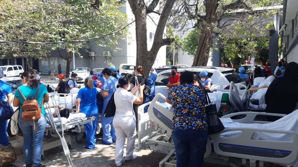 Durante las maniobras, diversos pacientes fueron evacuados, y algunos permanecían en sus camas, custodiados por una enfermera, quién le sostenía el suero.