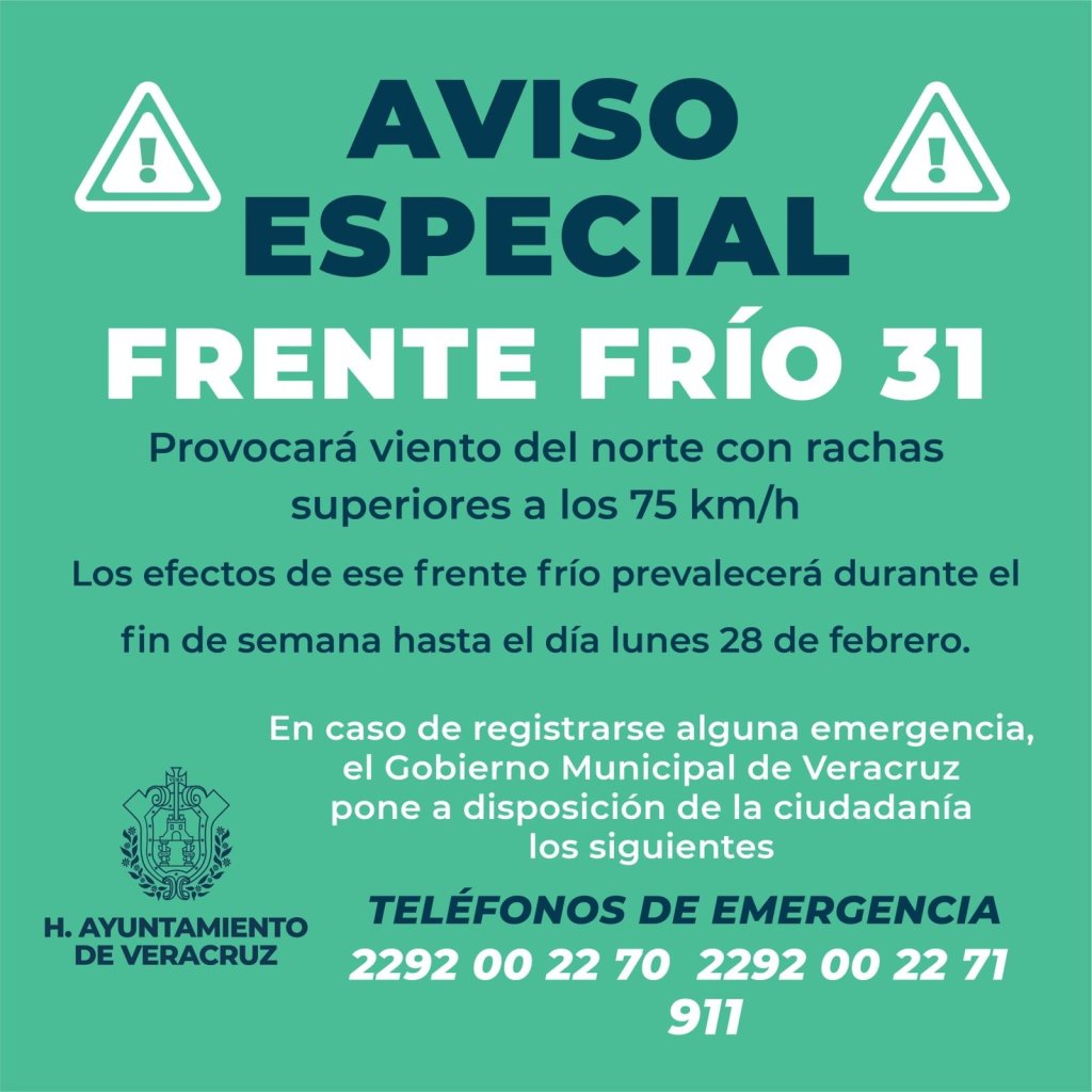 El Gobierno Municipal de Veracruz, a través de la Unidad de Protección Civil, hace un aviso especial sobre la entrada del Frente Frío No. 31, el cual provocará viento del norte con rachas de entre los 50 a los 70 kilómetros por hora (km/h) a partir de la noche de este viernes, 25 de febrero.