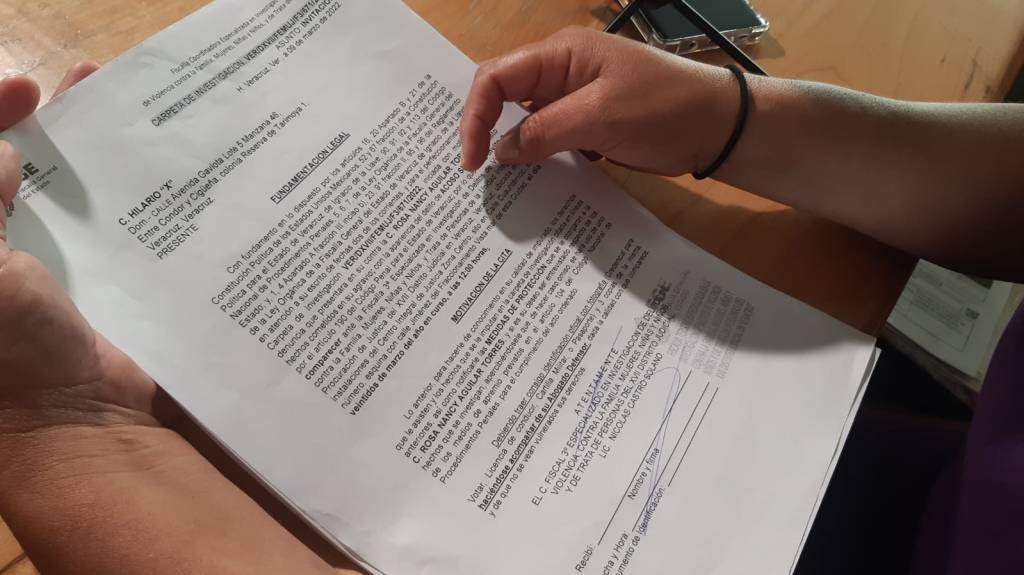El pasado 9 de marzo volvió a denunciar a su agresor, quien últimamente la sigue al salir de su casa; pero en un mal proceder de la Fiscalía de Veracruz, envío a la misma víctima a entregar el citatorio a su agresor, aunque esté y su familia no lo ha querido recibir.