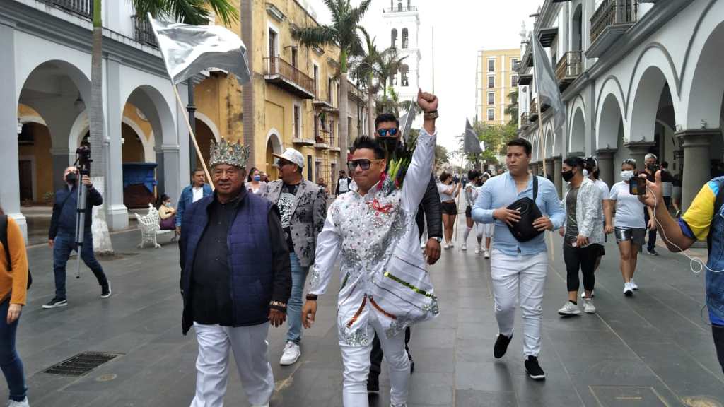 El candidato realizó un alegre papaqui, acompañado por exreyes, familiares y amistades. El contingente desfiló por todo el Zócalo de Veracruz hacia las oficinas del Comité Organizador, donde recibió su certificado de registro oficial.