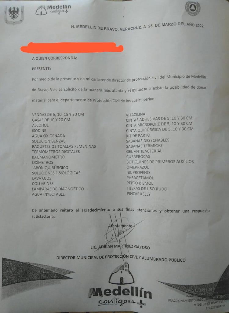 «Para entregarme ese dictamen, el señor me está pidiendo una donación de insumos, que va desde gasas, hasta kit’s de parto, vendas, todo eso para Protección Civil de ahí, de Arboledas San Ramón. No es para la escuela, es para él, y que él me pueda entregar el dictamen qué puedo tener la escuela abierta (…) tenemos el conocimiento de que no somos las primeras (…) es más o menos arriba de 2 mil pesos, porque tan solo un kit de parto, no tengo idea de que incluye, pero nos pide baumanómetros, oxímetros, termómetros digitales y eso es caro, nos está pidiendo vendas de 5, de 10, de 15 y de 30 centímetros, gasas de 5 y de 10, no nos está pidiendo por cajas, pero si nos dice una lista de las cosas», puntualizó la señora Mariela Cárdenas.