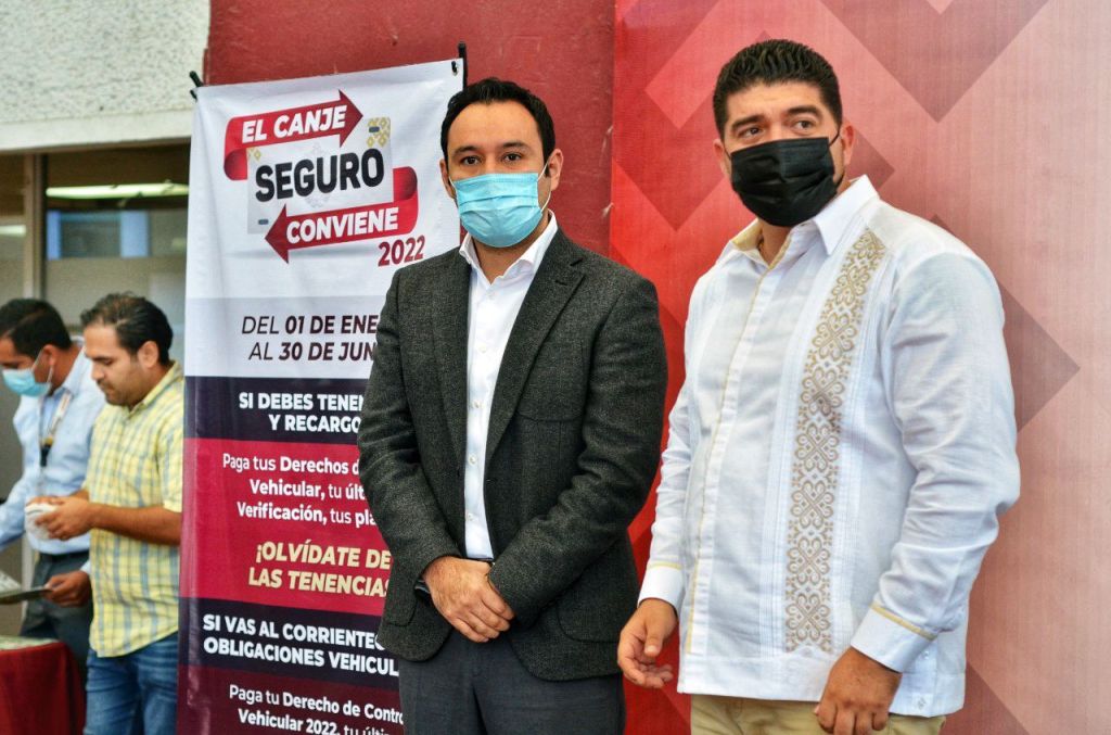 El secretario de Finanzas y Planeación, José Luis Lima Franco, y el secretario de Educación, Zenyazen Escobar García, atestiguaron el inicio de actividades de esta mesa cuyo propósito es que los trabajadores tengan mayores facilidades para poner en orden adeudos o realizar el canje de placas de forma gratuita, si se encuentran al corriente con el pago de derecho vehicular y última verificación.