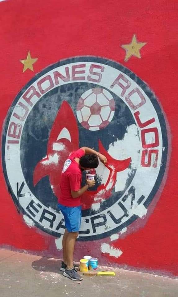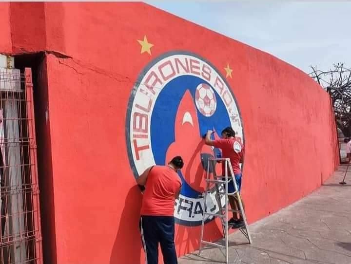 Boca del Río, Ver.- Aficionadas del club Tiburones Rojos pintaron un tramo de la barda del estadio Luis de la Fuente «El Pirata», previo al aniversario de la fundación del equipo de fútbol.