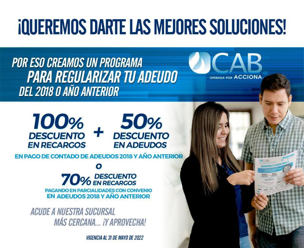 Con la finalidad de apoyar a la economía familiar, el gobierno de Boca del Río ha acordado con la Compañía de Agua del Municipio (CAB) una serie de descuentos y facilidades de pago de adeudo a los que el usuario podrá acceder durante los meses de abril y mayo del presente año.